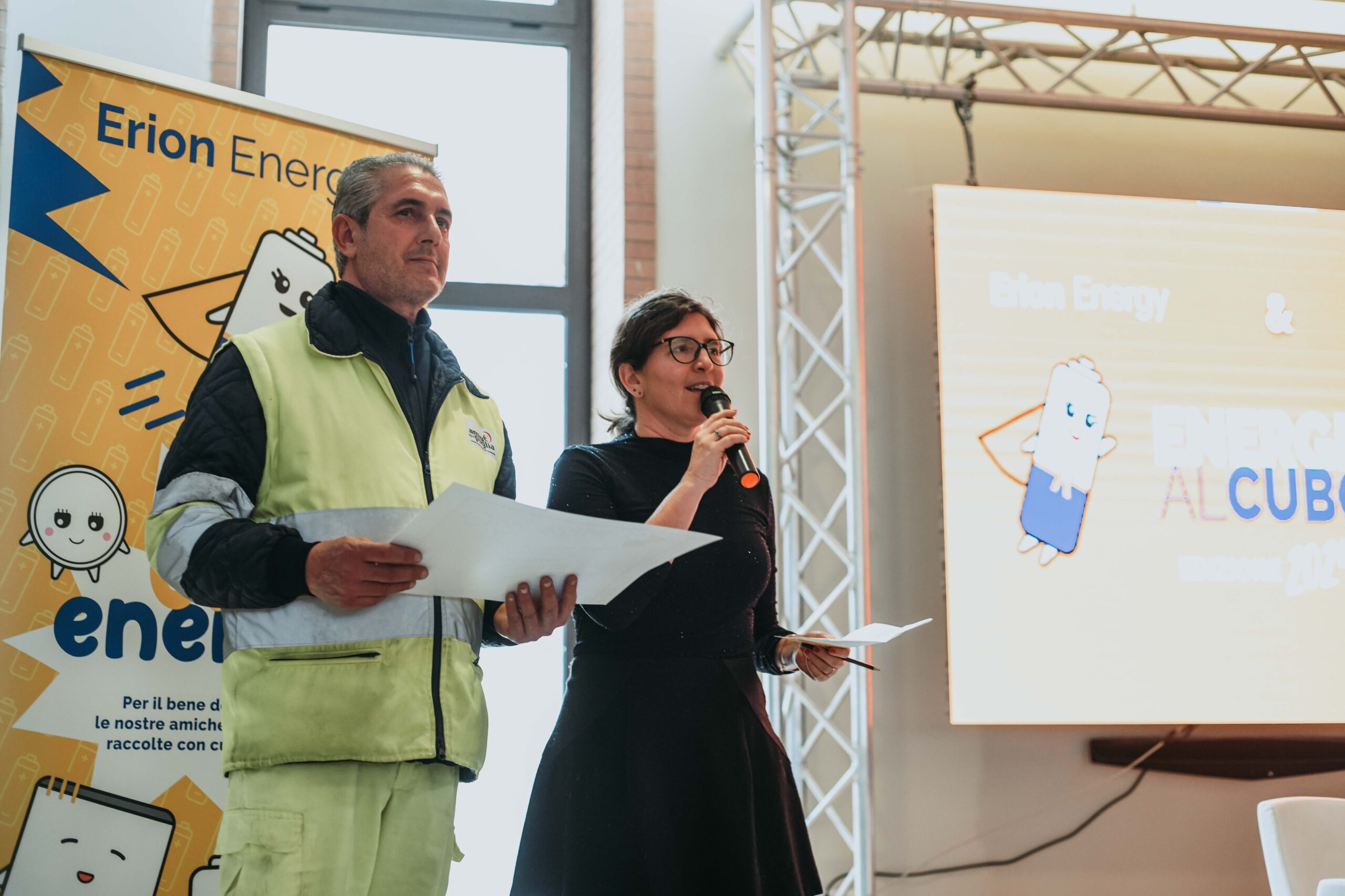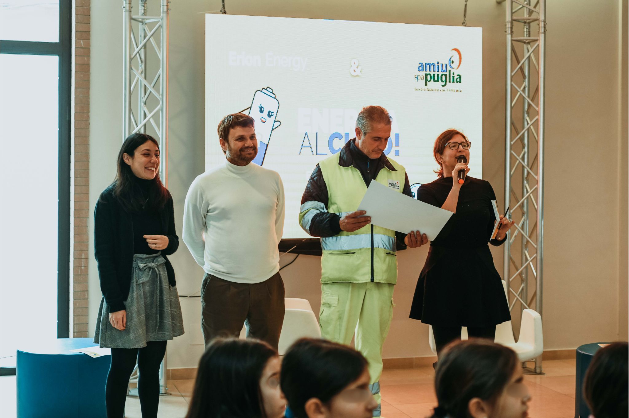 La cerimonia di premiazione si è svolta il 26 febbraio 2025 alla Pinacoteca “la9cento” di Foggia. Hanno partecipato Laura Castelli, Direttore Generale di Erion Energy, Vincenzo Gadaleta, Dirigente Tecnico Servizi U.O. Amiu Puglia, Fabrizio Baia, Membro del Cda di Amiu Puglia, Lucia Aprile, Assessora all’Ambiente del Comune di Foggia, Davide Emanuele, Assessore alle Partecipate del Comune di Foggia e Domenico Di Molfetta, Assessore all’Istruzione del Comune di Foggia.